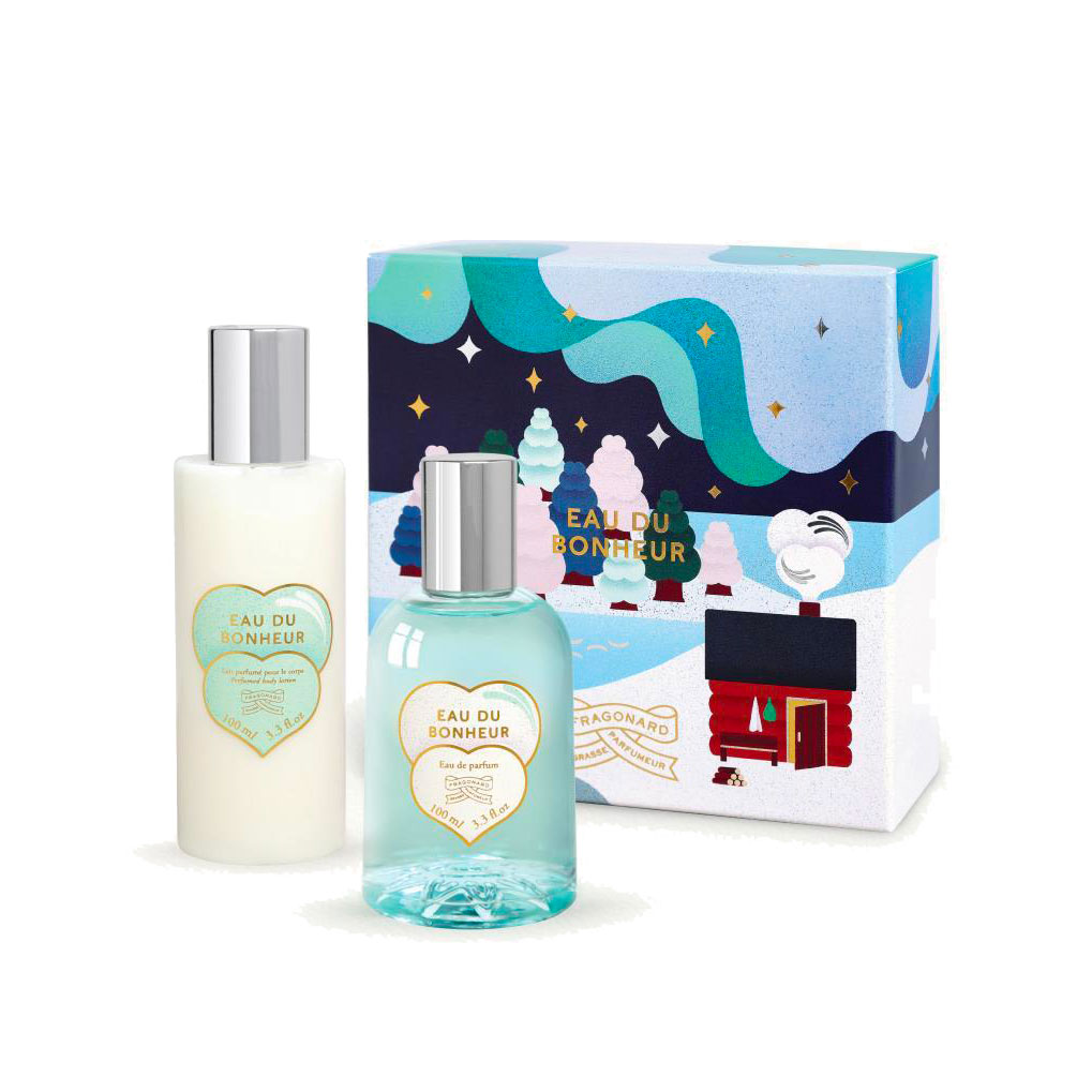 Racchiusa in un cofanetto decorato con un paesaggio nordico si trova la creazione profumata: Eau du Bonheur, reinterpretata in una versione esclusiva, più intensa, eau de parfum. Abbinata alla sua crema corpo